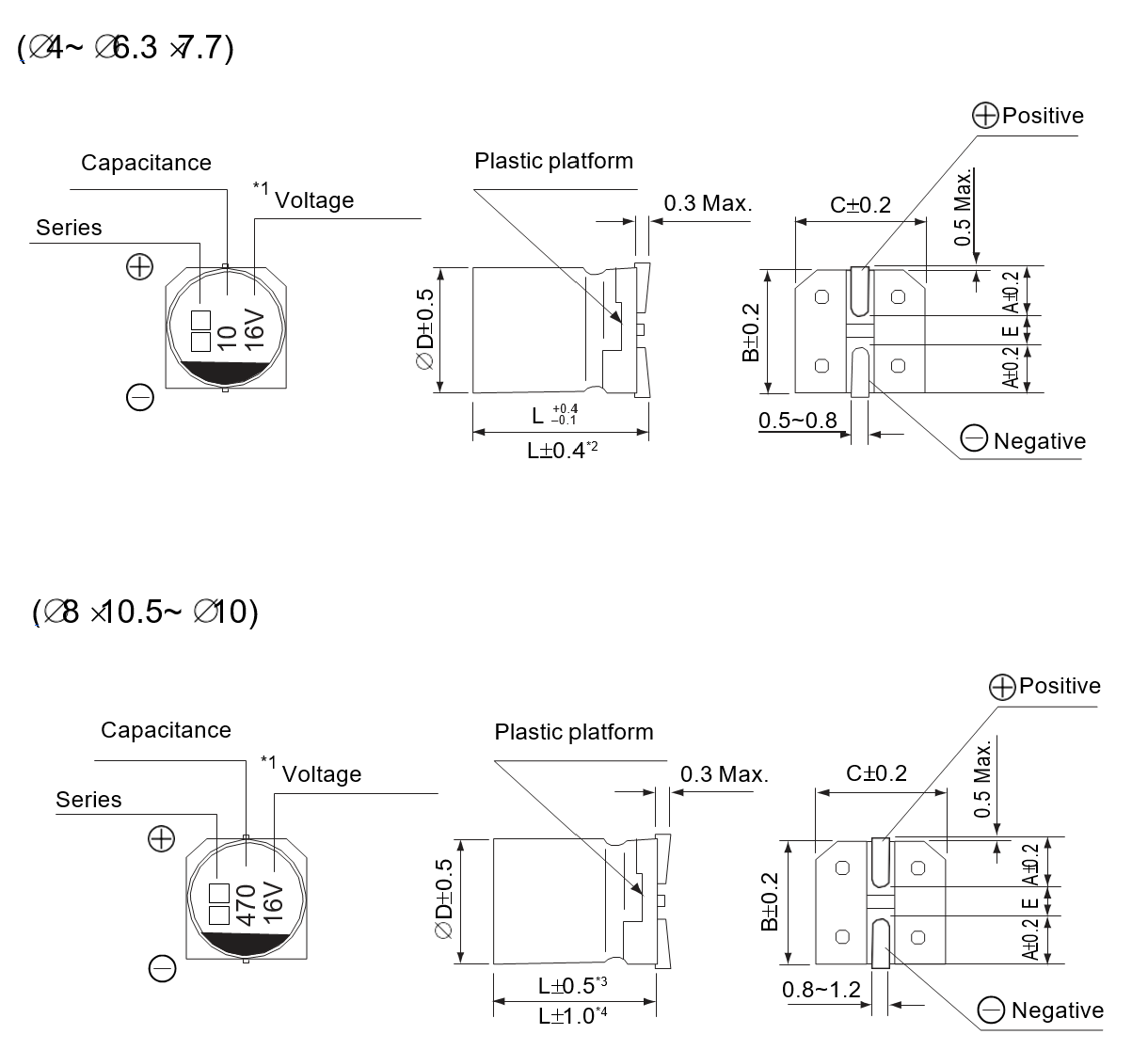 Voltage: 6.3 ~ 50V DC Capacitance: 10 ~ 2200uF Tolerance: ±20% at 120Hz, 20°C