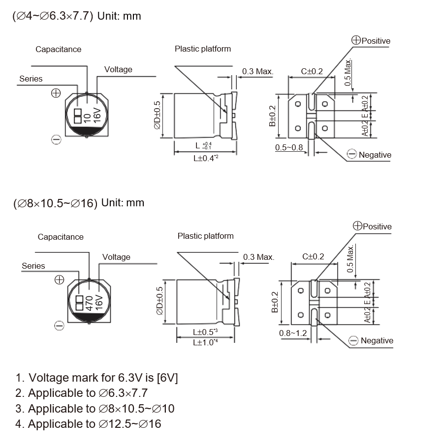 Temperature: -55 ~ +105°C Load life: 1000 ~ 3000 hrs. Voltage: 6.3 ~ 50V DC Capacitance: 4.7 ~ 4700μF Tolerance: ±20% at 120Hz, 20°C
